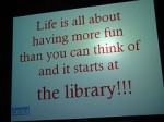 C’est neuf, c’est beau, c’est design, et c’est surtout bien pensé : l’espace formation multimedia, l’espace jeux vidéo (à utiliser sur place ou à emprunter), des coins repos, des coins repas, une future cabine d’enregistrement audio, des fauteuils d’écoute sur place… Oui, je veux bien croire le slogan de l’une des slides finales : « La vie c’est s’éclater plus que vous ne pouvez l’imaginer – et ça commence à la bibliothèque ! »